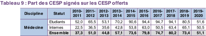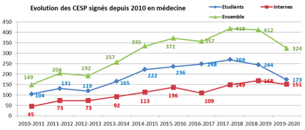 Le dernier bilan du Centre National de Gestion montre qu’en 2020, 3020 CESP avaient été signés depuis sa création en 2010 6Centre National de Gestion (CNG), Données sur les contrats d’engagement de service public (CESP) conclus avec les étudiants et internes en médecine et odontologie, 2021.
